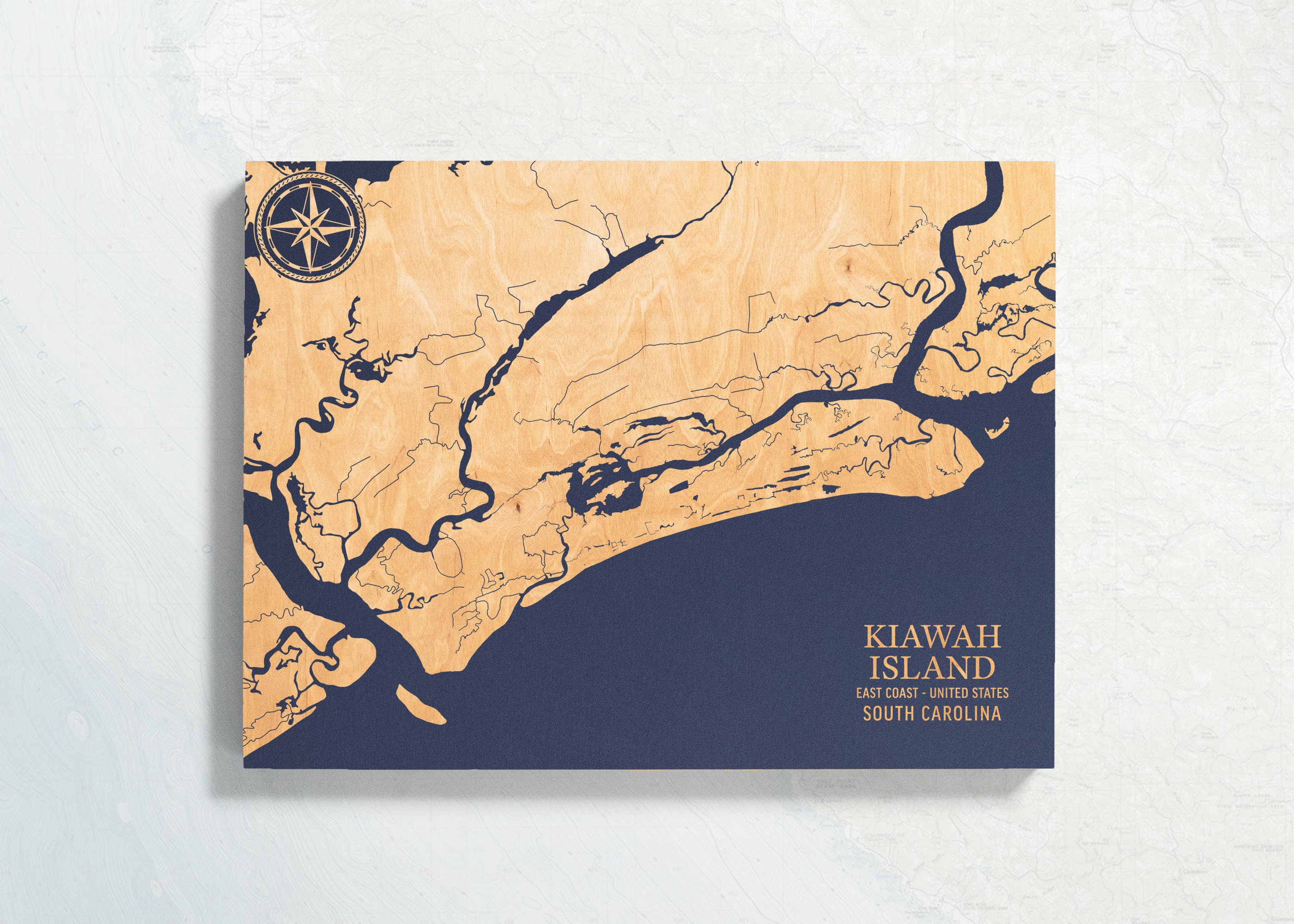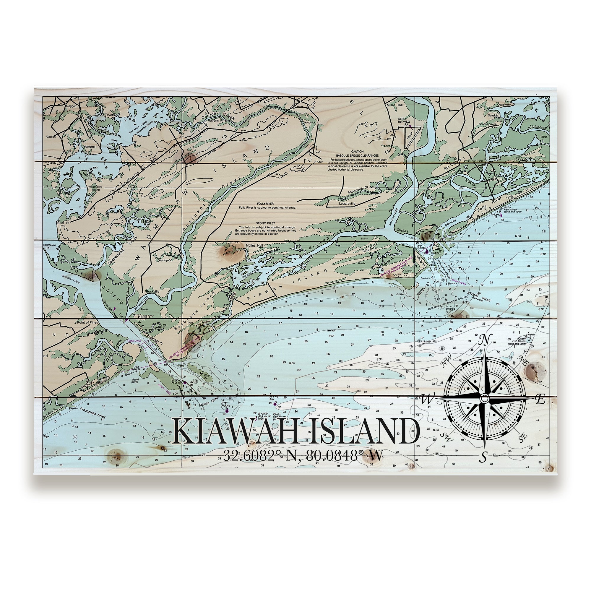 Kiawah Island, South Carolina Map Engraved Wood Coastal Chart Wall